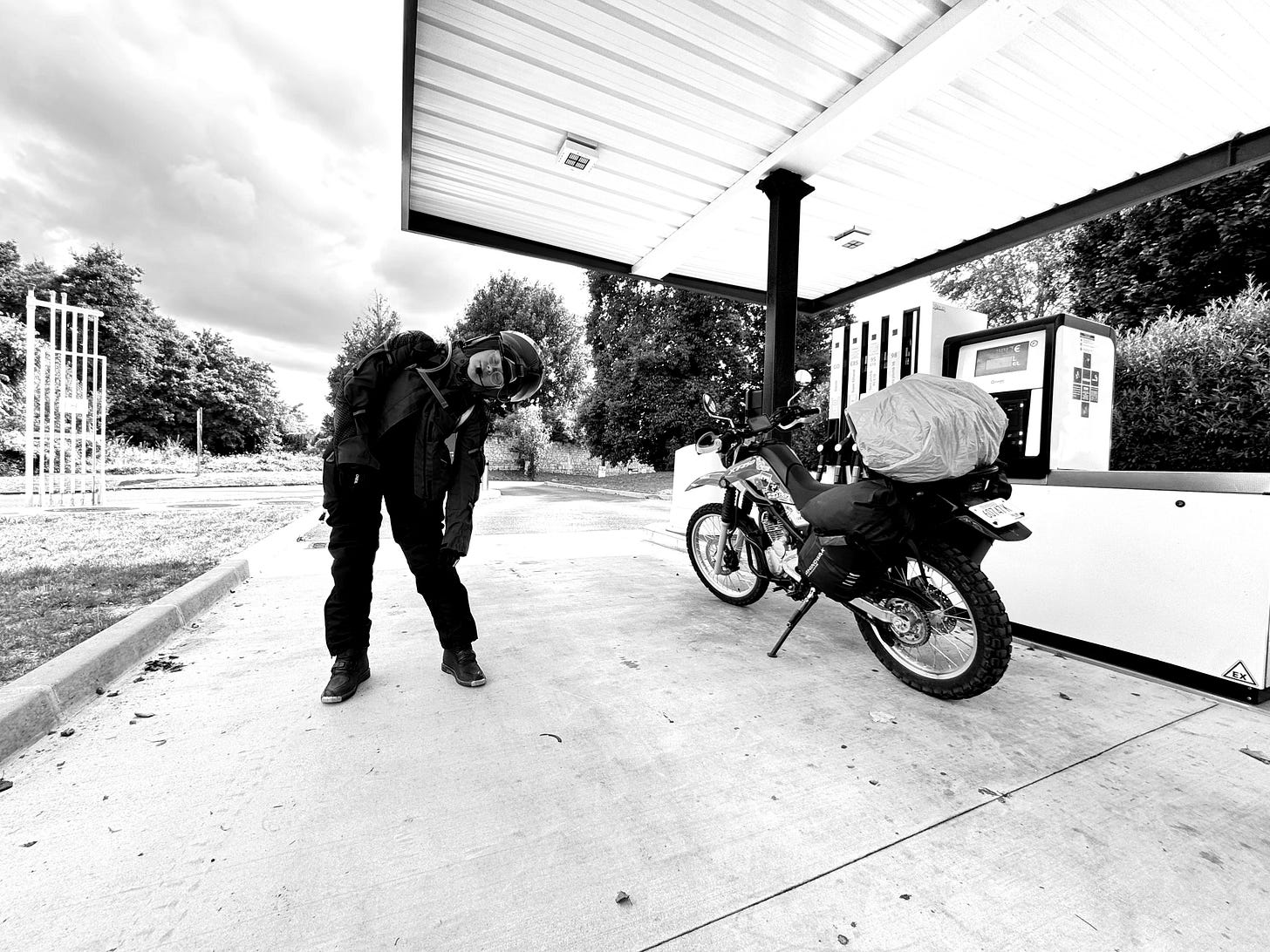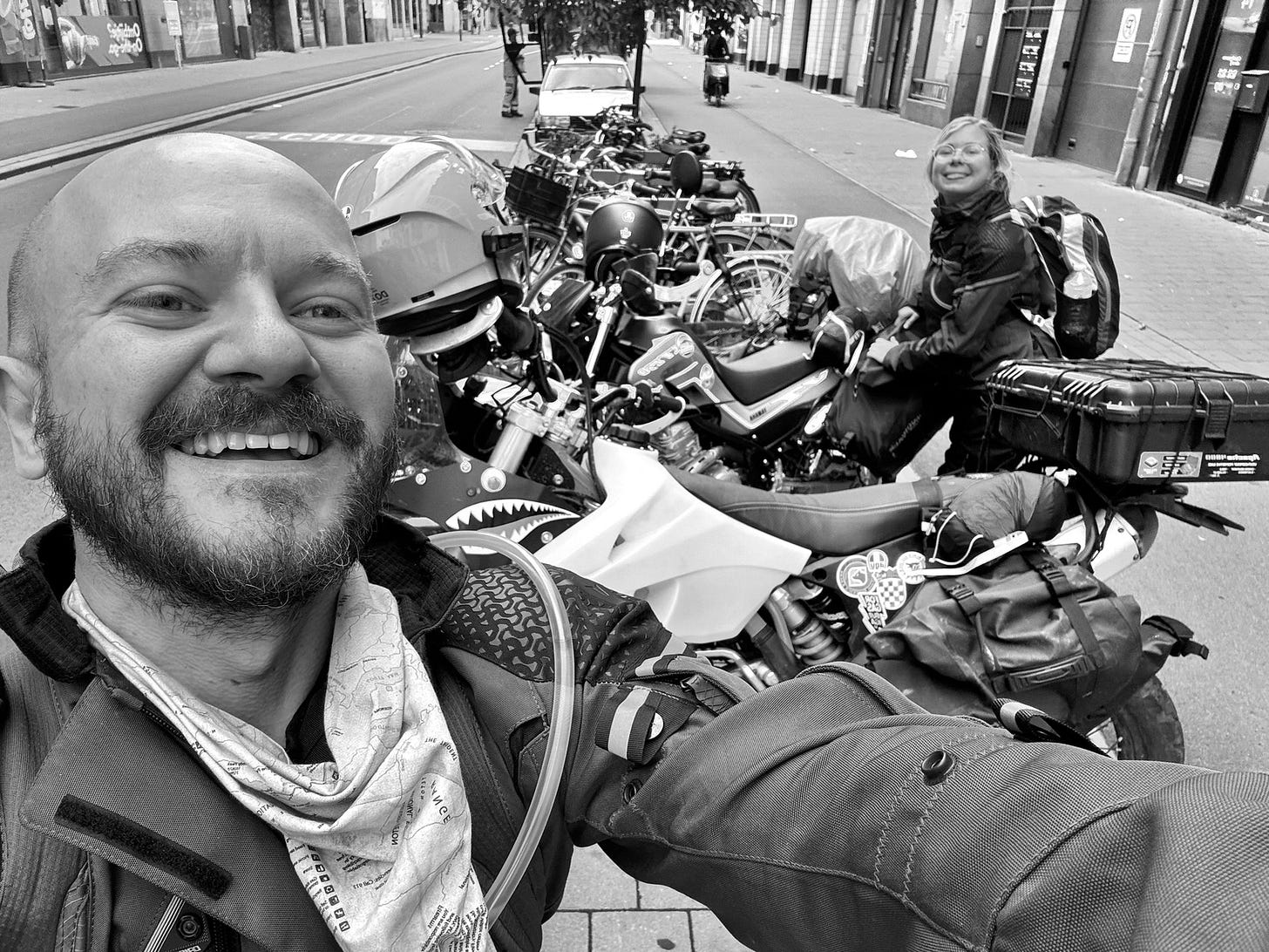 Or consider clothes. My wardrobe consists of three shirts, three pairs of underwear, three pairs of socks, a pair of joggers, and one pair of jeans, all made of Merino Wool because I pity the fool who travels with cotton. Tay, who is generally a walking confetti cannon of color and charm, initially tried to bring expressive pieces. But reality smudged all of that away. My bright white t-shirts don’t survive a week in these conditions. Patterns fade. Dirt doesn’t. Eventually, we both defaulted to monochrome. Everything’s black or dark gray now - because it hides the road grime and chain oil and mystery stains from that one night we camped next to a muddy flax seed field with mud the consistency of room temperature butter (don’t ask).