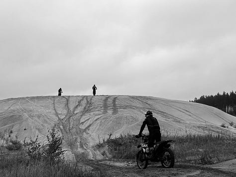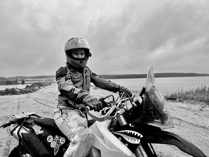 Our instructor immediately picked up on our… let’s say gentle energy. Before even touching the bikes, we had to explain that yes, we wanted to learn the rough stuff, but no, we could not send our motorcycles cartwheeling into a bog because then we would have to sleep in that bog. Taylor had the opportunity to again flex her therapeutic calm and talk Scott off a ledge of abject panic, all while stretching her bike Sammie’s slightly abbreviated legs. Our instructor nodded with the patience of a man used to coaxing nervous puppies through agility courses, then eased us into the day.