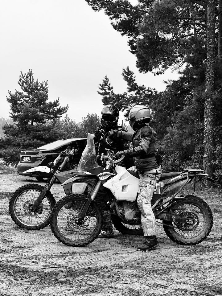 .The next morning was a different sort of thrill. Tay had booked us into an off-road enduro training session with OneLove Enduro, and Scott’s stomach had been quietly vibrating with dread from the moment we arrived. We rolled up on our travel-worn machines; laden with rally towers, soft bags, tools, and all the emotional significance of being our literal homes. Everyone else arrived in crisp hard-enduro gear with lightweight race bikes unloaded from immaculate Sprinter vans. You could practically hear “who invited the overlanders” humming in the air.
